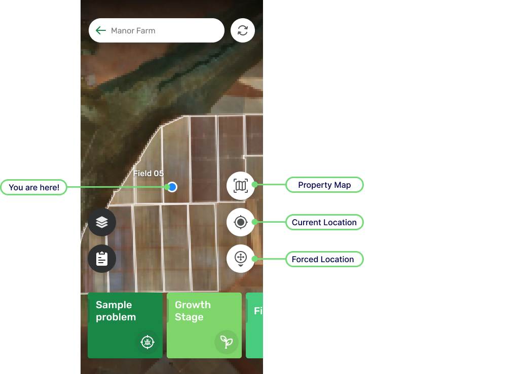Independientemente de su posición actual, si pulsa este botón podrá seguir viendo el mapa de la propiedad. Utilice esta opción para disponer de una visión general de las áreas, incluyendo los nombres de los campos. No dude en hacer zoom en el mapa en cualquier momento.