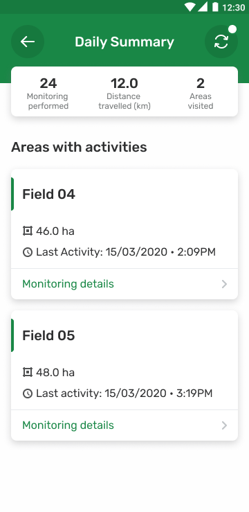 La aplicación Scouting proporciona un resumen diario de todos los eventos registrados el mismo día, incluso antes de que el dispositivo se sincronice. Con esta función, se pueden ver las últimas actividades realizadas por el usuario del dispositivo, tales como: seguimiento realizado, distancia recorrida, áreas visitadas y el tipo de tareas que se realizaron en cada área. He aquí algunos ejemplos de Daily Summary (Resumen diario).