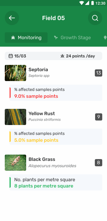 Consejo: Una vez que haya seleccionado un campo de la lista Daily Summary (Resumen diario), puede desplazar la barra superior hacia la derecha para ver otras opciones, tales como: Monitoring (Seguimiento), Growth Stage (Etapa de crecimiento), Fixed Point (Punto fijo), Annotation (Anotación), Spray Application (Aplicación de pulverización) y Sample (Muestra).