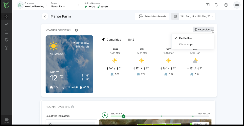 La vista meteorológica proporciona información útil como la temperatura (mín./máx.), las lluvias previstas y la velocidad del viento. La información está disponible en el Web panel (Panel de web) y se basa en la integración de Protector con proveedores externos de previsión meteorológica. El usuario puede modificar el origen de la información seleccionando el proveedor en el menú superior derecho del widget.