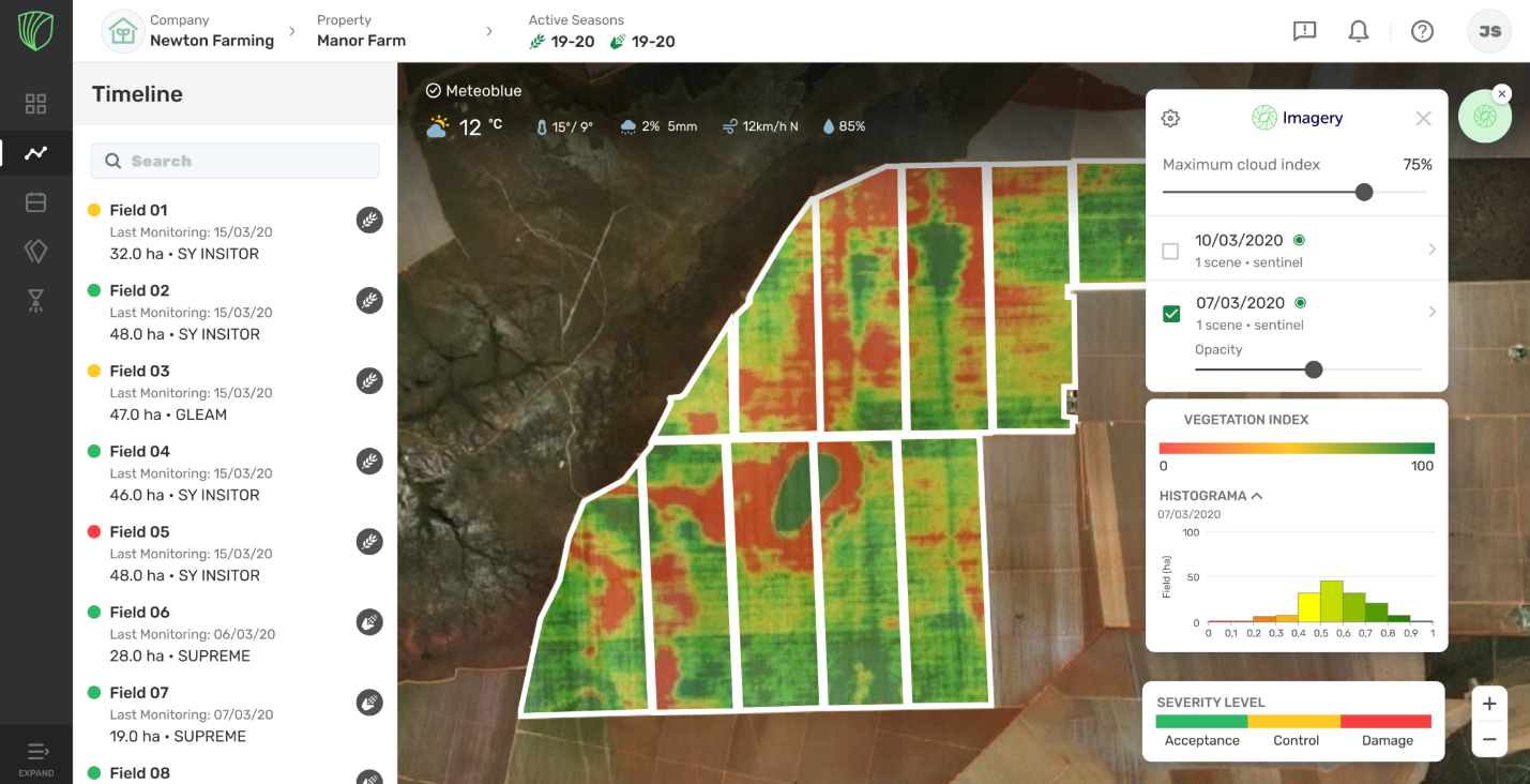 Una vez activada la integración de imágenes, haga clic en el icono Engine (Motor) para seleccionar el tipo de imágenes que se desee ver [NDVI, SAVI, RGB] y el proveedor de datos.