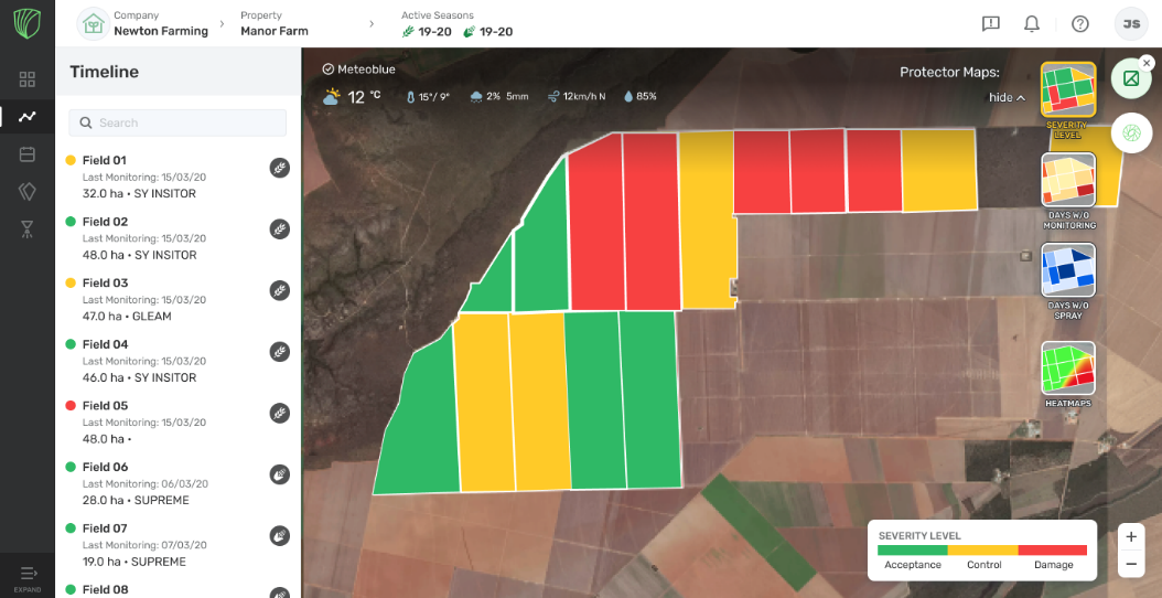 El mapa de nivel de gravedad se basa en planes agronómicos [metodologías] que hay detrás de cada cultivo. Estos planes son los responsables de los grupos de inspección y los indicadores visibles en Protector Scouting. Cada indicador se configura con un control [Amarillo] y un umbral de daño [Rojo]. Si se alcanza cualquiera de estos umbrales durante el seguimiento, el mapa de nivel de gravedad se actualizará para reflejar estos datos. El mapa muestra un resumen de todos los puntos de muestreo para cada campo y exhibirá el color como Amarillo o Rojo incluso si solo un indicador ha cruzado dicho umbral en particular.